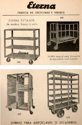 Gracias al desarrollo tecnológico aplicado a la fabricación de una amplia gama de carros, carretas y carretillas manuales para transportes comerciales e industriales, así como también a la construcción de escaleras rodantes y tipo torre para cambio de luminarias y manutención de todo tipo de edificios y espacios verdes públicos y privados (ferrocarriles, plazas, grandes residencias, establecimientos industriales, etc).y a poco tiempo de su creación Eterna se transformó en líder en su rubro. También se construyeros escaleras telescópicas para montaje sobre camiones de bomberos y empresas de servicios públicos primero en madera y luego en aluminio. |